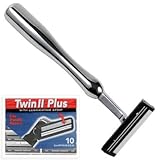 Our Twin Blade razor is the one that you thought wasn't being made anymore! Ours has the quality that will rival any that were ever made. The is a solid metal razor that has that "heavy in the hand feel". Both beautiful and economical this combination delivers an extremely smooth and close shave. This razor accepts any standard twin blade cartridge, and we provide 10 Personna Twin 2 blades with the Lubrastrip with this package. The cost of refills for this razor is much less than the 4 or 5 blade razor cartridges yet we believe the shave is smoother due to less pull and increased razor handle weight This razor is sure to please!