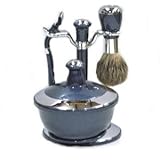 Sleek, stylish and classically designed, this handsome set will make shaving a treat. Includes 4 detailed pieces, all fashioned from rich navy blue finished lucite with chrome finished accents. The dual sided stand holds a pure natural bristle brush and a razor that uses Gillette Mach 3 replacement blades Also features a resting spot for your shave bowl. The bowl, with a handy mirror on the underside of the lid, keeps your shaving soap (included) fresh and dust-free. A quality and timeless set. Gift-boxed and ready for the man who appreciates the finer things in life. Sterilized and vulcanized. Wash with soapy water as needed and leave to dry naturally.>>>>>>This set includes: Stand-9.5 in. tall x 6.5 in. wide, Lidded Bowl-4.25 in. diameter x 4 in. tall, Shaving Soap-3 in. diameter, Razor-6 in. tall. Brush-4.5 in. tall.